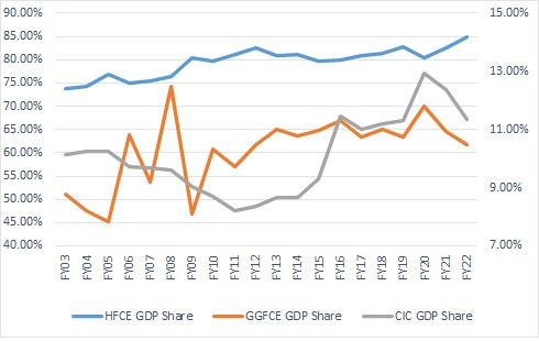 Figure one shows Household consumption share on the left vertical axis and government consumption and CIC shares on the left vertical axis. First up, we can see that GGFCE and CIC do not exhibit one relationship. The seem to move in opposite directions for the first ten years in our data (FY03 to FY13) after which they move in the same direction. This could be because of the dollar inflow in the first decade of the War on Terror (WoT). These inflows financed government spending and it didn’t need to borrow as much from the SBP to finance its expenditures. HFCE increases steadily from 73% to 85% in the two decades shown here. This is interesting and significant. The past two decades also mark a shift in the government’s strategy to spur growth in the country. Shaukat Aziz led finance ministry (and later the government) in the early 2000s relied on creating consumption led growth boom by maintaining low interest and exchange rates financed by foreign inflows. Successive governments ever since have tried similar strategies to cause short term growth in the economy without really thinking about its negative consequences. For example, each one of this consumption led boom has followed a bust because once the foreign inflows (mostly aid and loans) dry up, the country runs into a balance of payment crisis i.e. it runs short of dollars to pay for its imports and service its debt. A balance of payment crisis quickly transforms into inflationary crisis that makes the government run to the IMF. We saw this story from 2008 to 2013 and then more recently since Fall of 2021. An important part of this story is to understand the income distribution in the economy. People with higher incomes, consume more. Pakistan National Human Development Report 2020 calculates that Top 20% share in total national income is at 49.6% while the bottom 60% own 29.7% of the national income. Naturally consumption in the country is concentrated at the top. Burki et. al. show that top 10% captured 24% of the total income growth in Pakistan from 2001-02 to 2015-16 as opposed to bottom 50% that captured 32.4% in the same time period. This means that as the economy grows the rich keep getting richer while the poor continue to struggle.